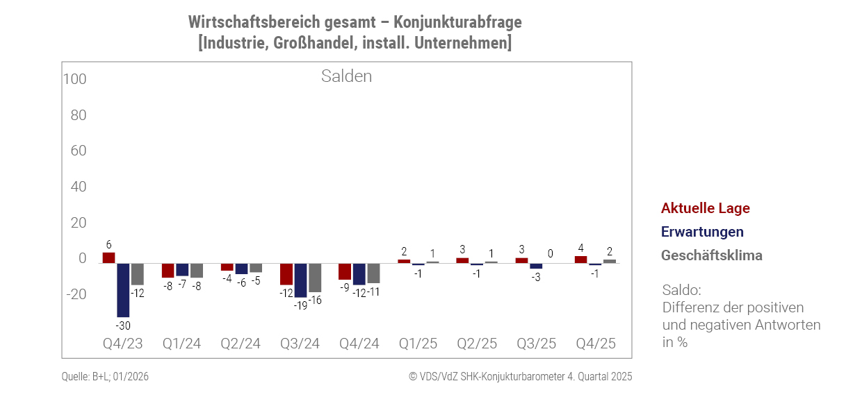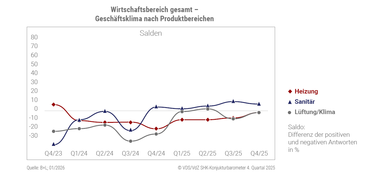 In den drei Produktbereichen zeigt sich ein differenziertes Bild: Sanitär lag im gesamten Jahr 2025 leicht im positiven Bereich und notiert aktuell bei +8. Der Bereich Heizung blieb 2025 durchweg negativ, zeigt jedoch eine Erholungstendenz und liegt im 4. Quartal 2025 bei -2. Im Bereich Lüftung/Klima zeigt sich hingegen nach zwei positiven Quartalen wieder eine Verschlechterung; das Geschäftsklima liegt aktuell bei einem leicht negativen Wert von -2.