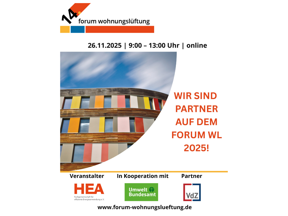 Am 26. November 2025 findet von 09:00 bis 13:00 Uhr das 14. Forum Wohnungslüftung digital und kostenfrei statt.