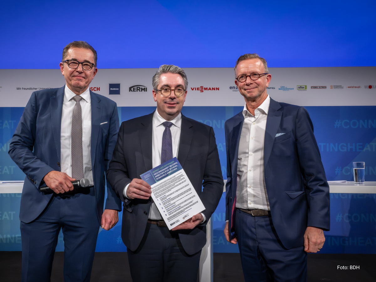 Der Bundesverband der Deutschen Heizungsindustrie (BDH) und der Zentralverband Sanitär Heizung Klima (ZVSHK) haben heute im Rahmen der Deutschen Wärmekonferenz #connectingheat in Berlin ein gemeinsames Forderungspapier an Stefan Rouenhoff, Parlamentarischer Staatssekretär im Bundesministerium für Wirtschaft und Energie (BMWE), überreicht.