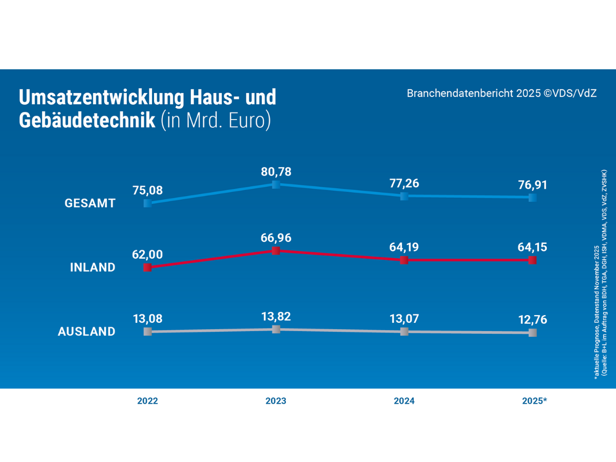 Die Wirtschaftsvereinigung Gebäude und Energie (VdZ) und die Vereinigung Deutsche Sanitärwirtschaft (VDS) haben zur VdZ-Mitgliederversammlung 2025 den neuen Branchenbericht zur Haus- und Gebäudetechnik vorgestellt. Der Bericht zeigt die wirtschaftliche Lage in Industrie, Großhandel und Handwerk für die Bereiche Heizung, Sanitär sowie Klima/Lüftung. Nach einem nominalen Umsatzrückgang von 4,4 Prozent im Jahr 2024 auf 77,26 Milliarden Euro wird für 2025 ein weiterer leichter Rückgang um 0,4 Prozent prognostiziert. Besonders stark betroffen ist die Industrie mit einem Minus von 9,5 Prozent, während der Sanitärbereich erste Anzeichen einer Stabilisierung zeigt. Im Großhandel sank der Umsatz um 13,2 Prozent, bei den installierenden Betrieben um 4,5 Prozent.
